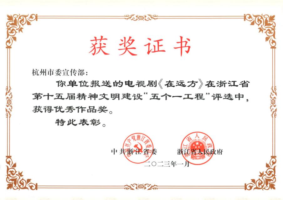 ● Die Fernsehserie „In a Faraway Place“ (In der Ferne) gewann den Preis für hervorragende Arbeit des 15. spirituellen Zivilisationsaufbaus „Five One Project“ in der Provinz Zhejiang (2022).